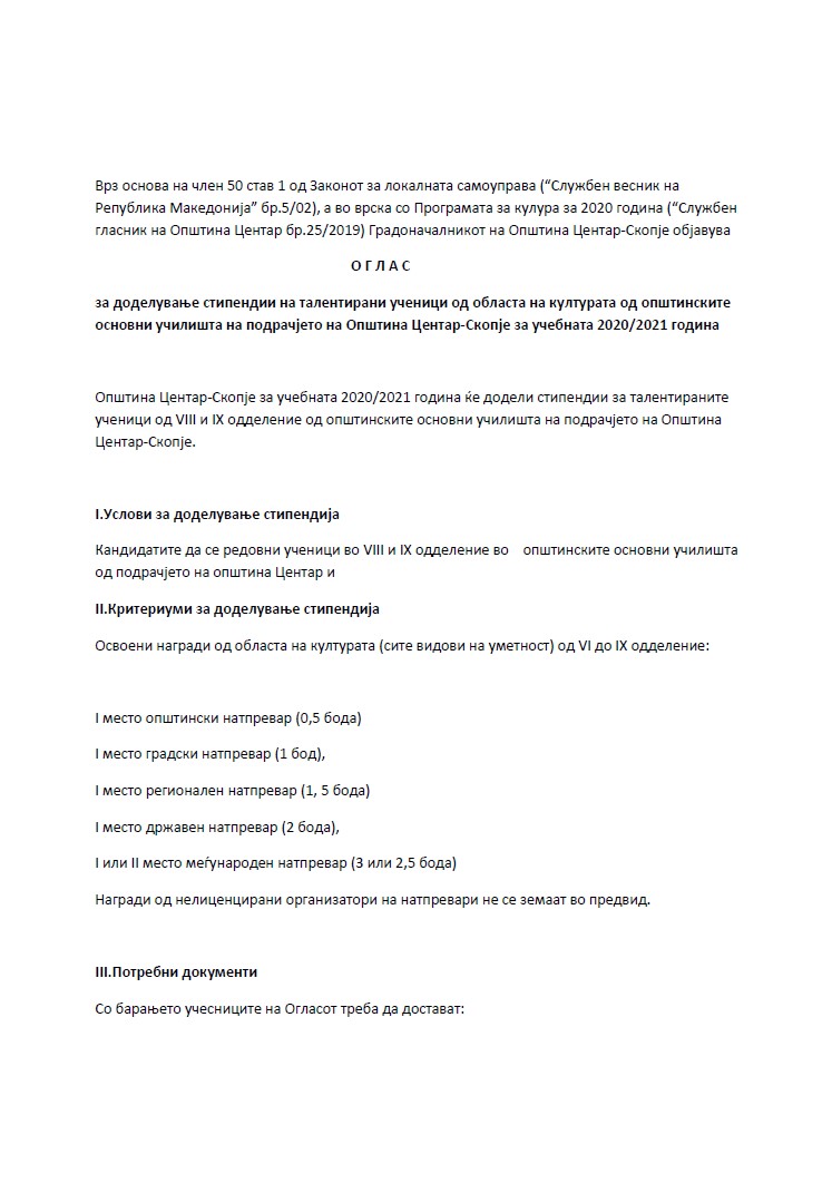 ОГЛАСИ за доделување на стипендии на талентирани ученици од општинските основни училишта на подрачјето на Општина Центар во учебната 2020/2021 година